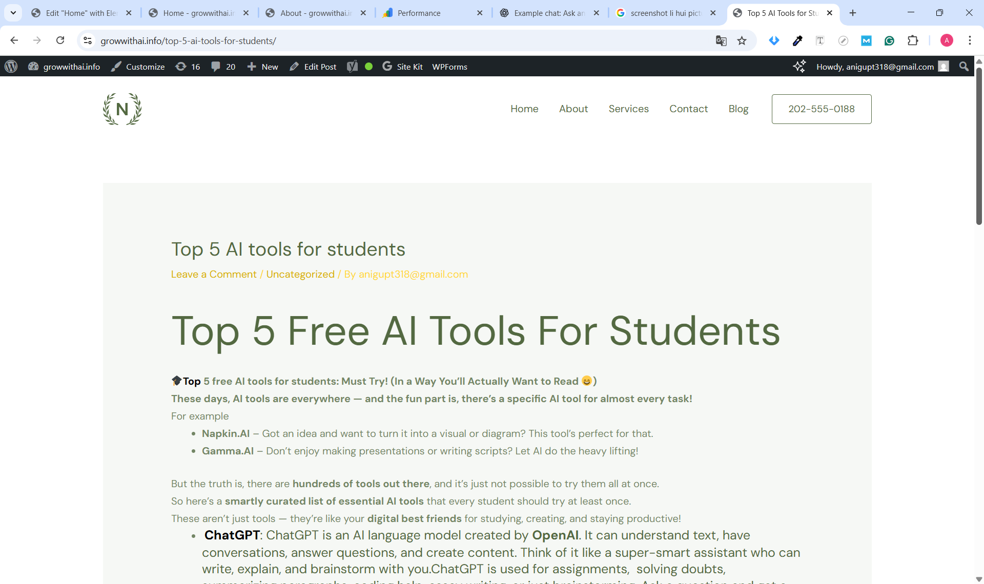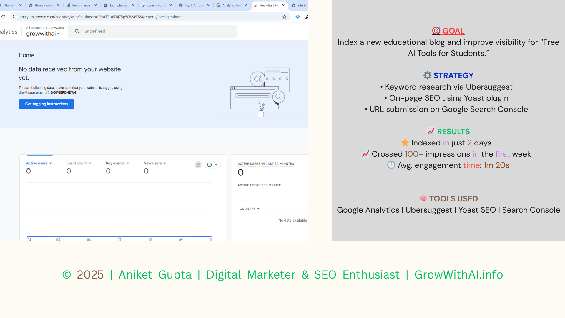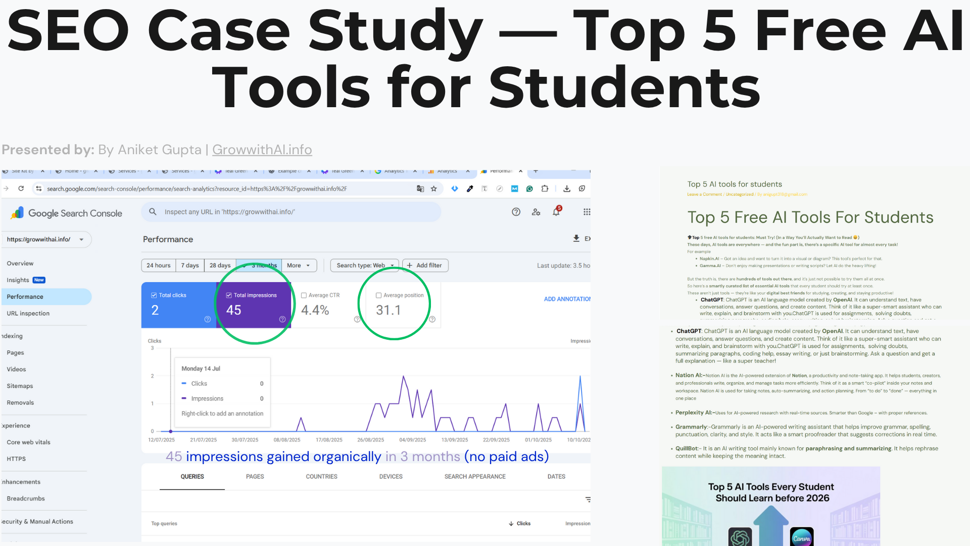 A short case study showing on-page SEO, keyword research, and indexing steps taken for the blog post “Top 5 Free AI Tools for Students”. This demonstrates basic SEO workflow and results using Search Console & Google Analytics.